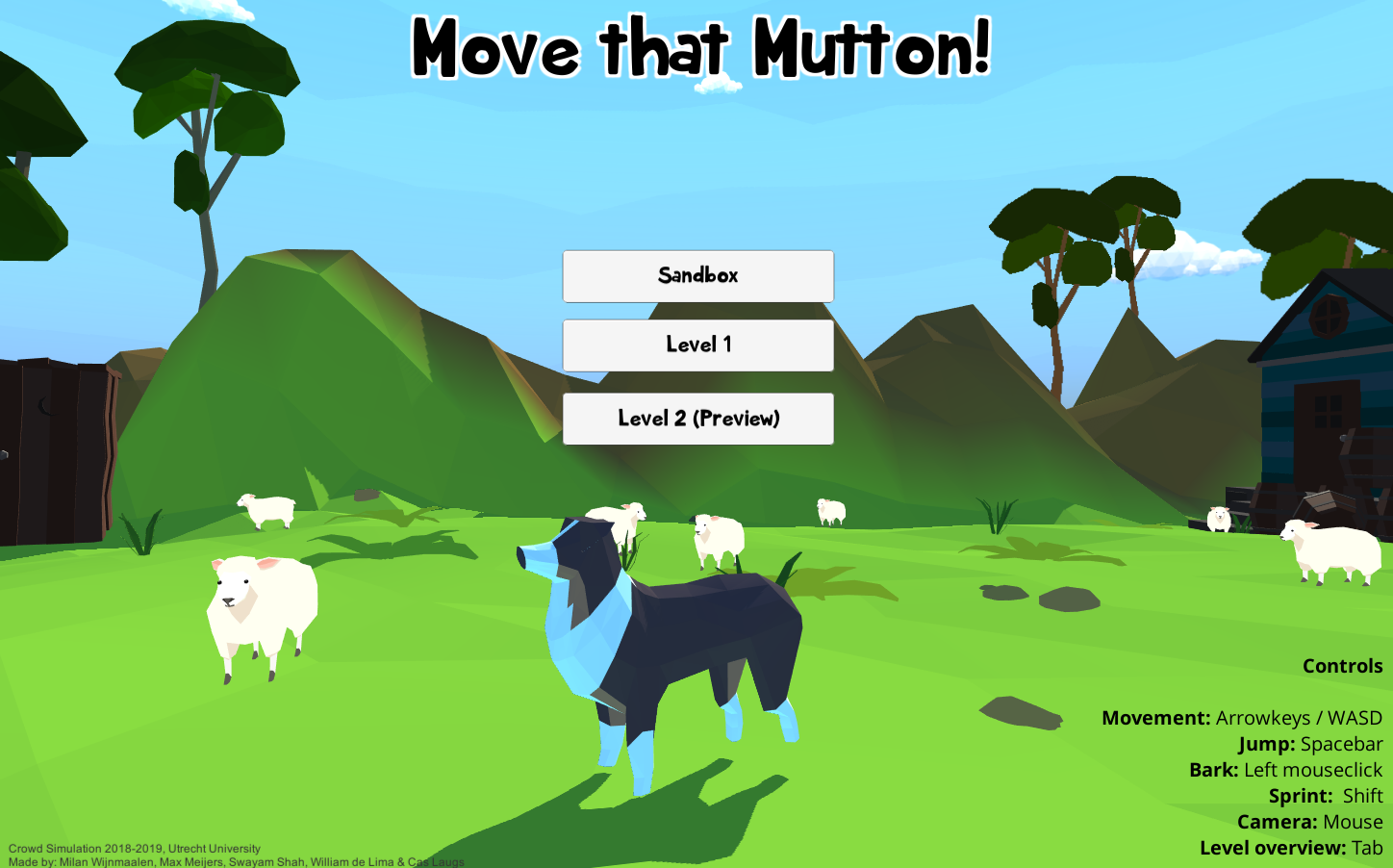 In this game you are a sheepdog, and the aim is to herd all the sheep into their pen. The behaviour of the sheep is simulated using the crowd simulation software from uCrowds