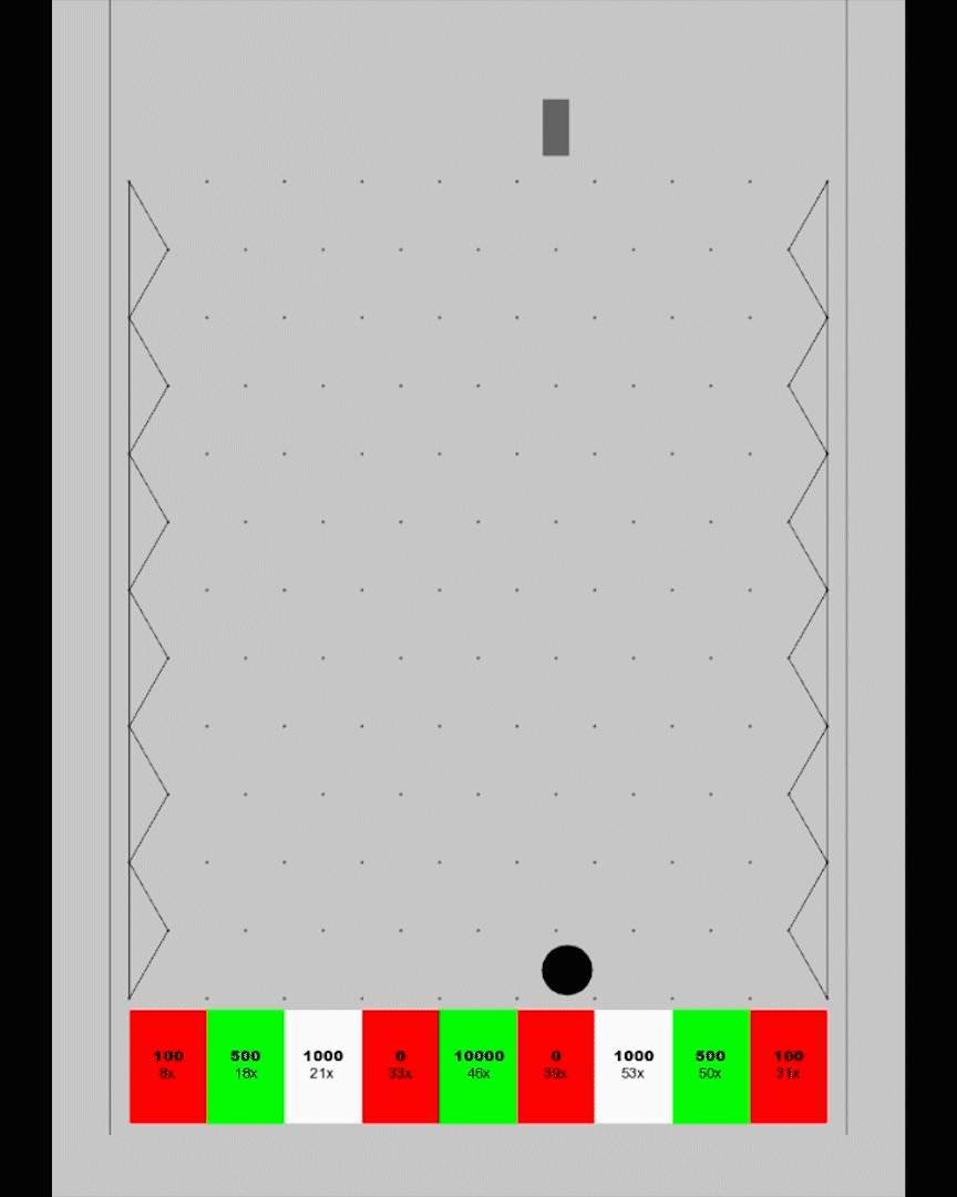 To answer the age old question "Which input will give me the highest chance for a prize?", I created a program to simulate the fall of a puck through the board. The simulation is as physically accurate as possible, using the correct gravity, dimensions and coefficient of restitution. The simulation is written in C++ using OpenFrameworks.